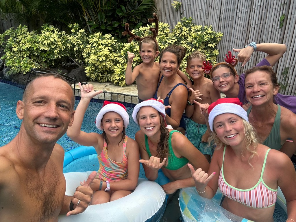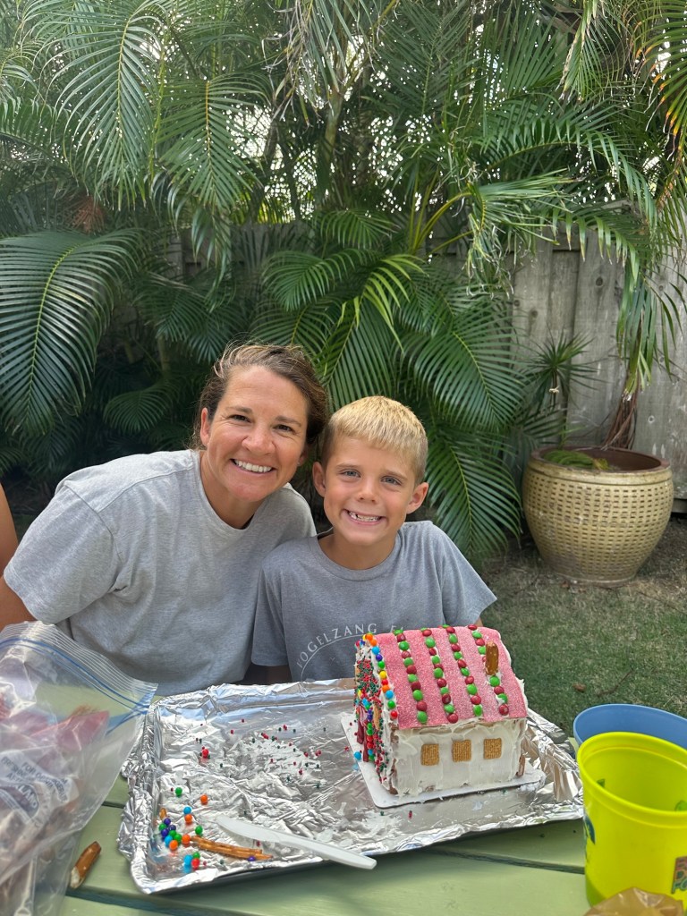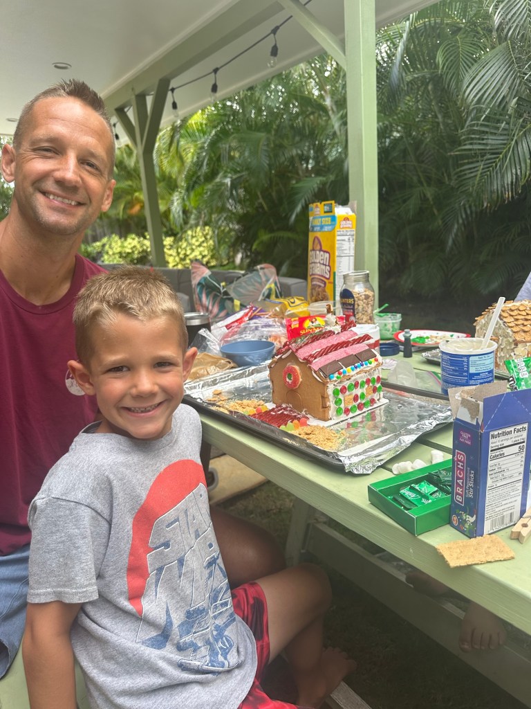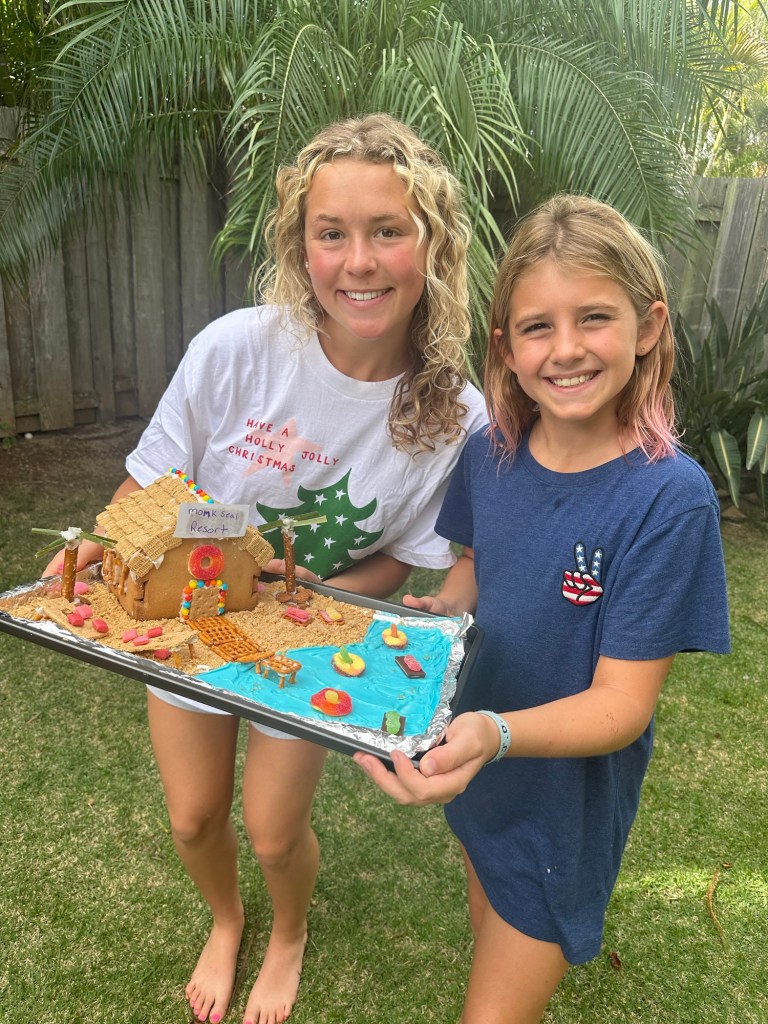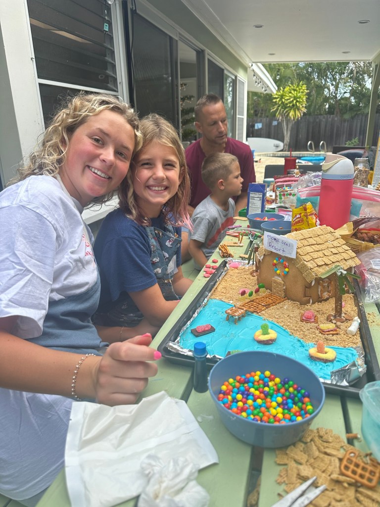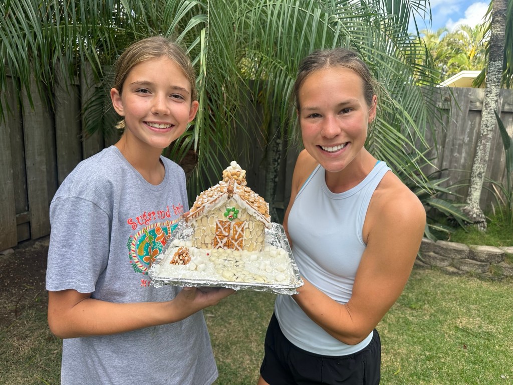 We had Elle visit again…but this time with Darla and Tess, our cousin and aunt, after visiting Kauai for a few days. We went to the beach, worked on a puzzle, had a gingerbread house competition, and celebrated Christmas! ( more on that later). The gingerbread house competition got judged from family from both ends of the country – Darla, Grammy, and Dorene!