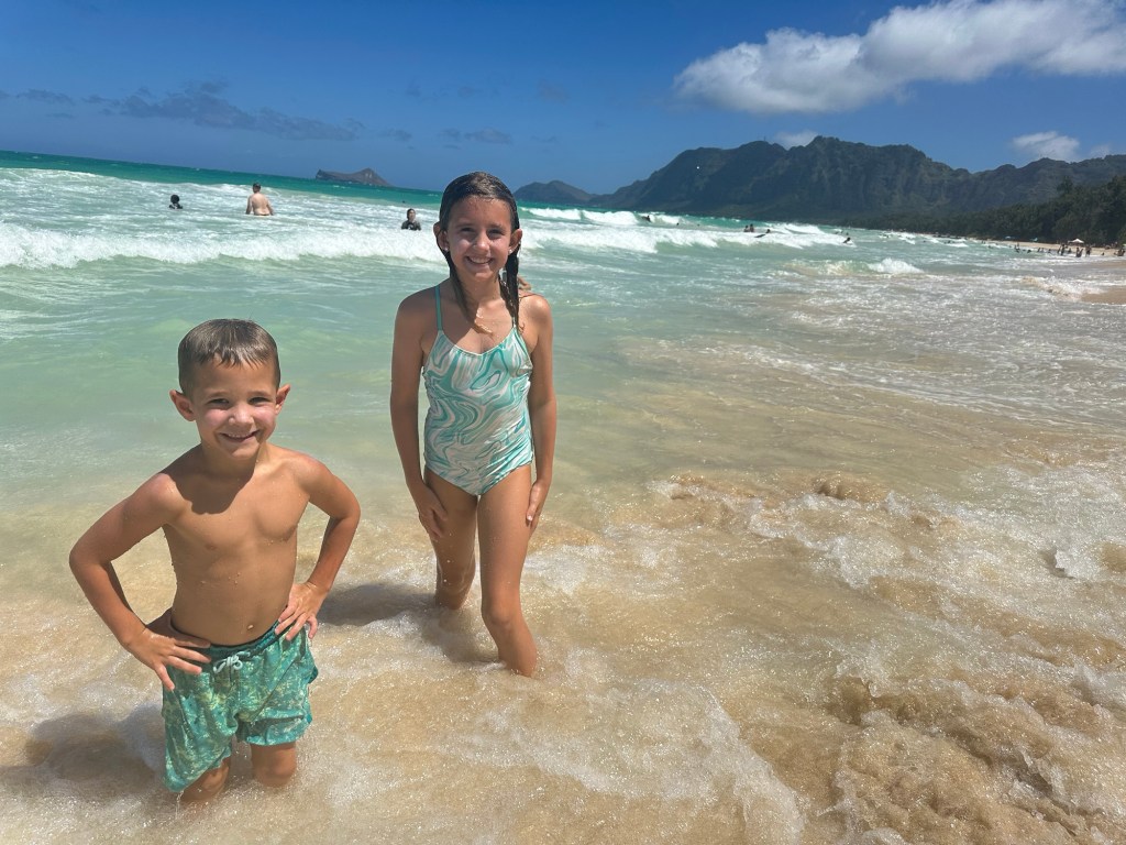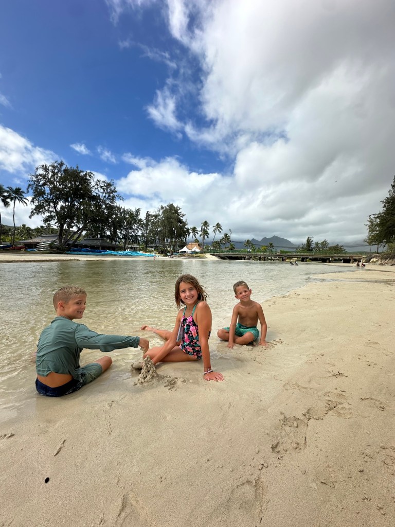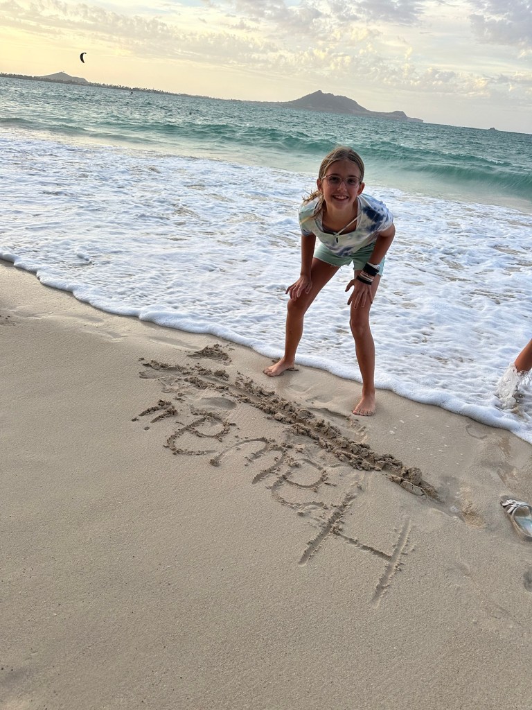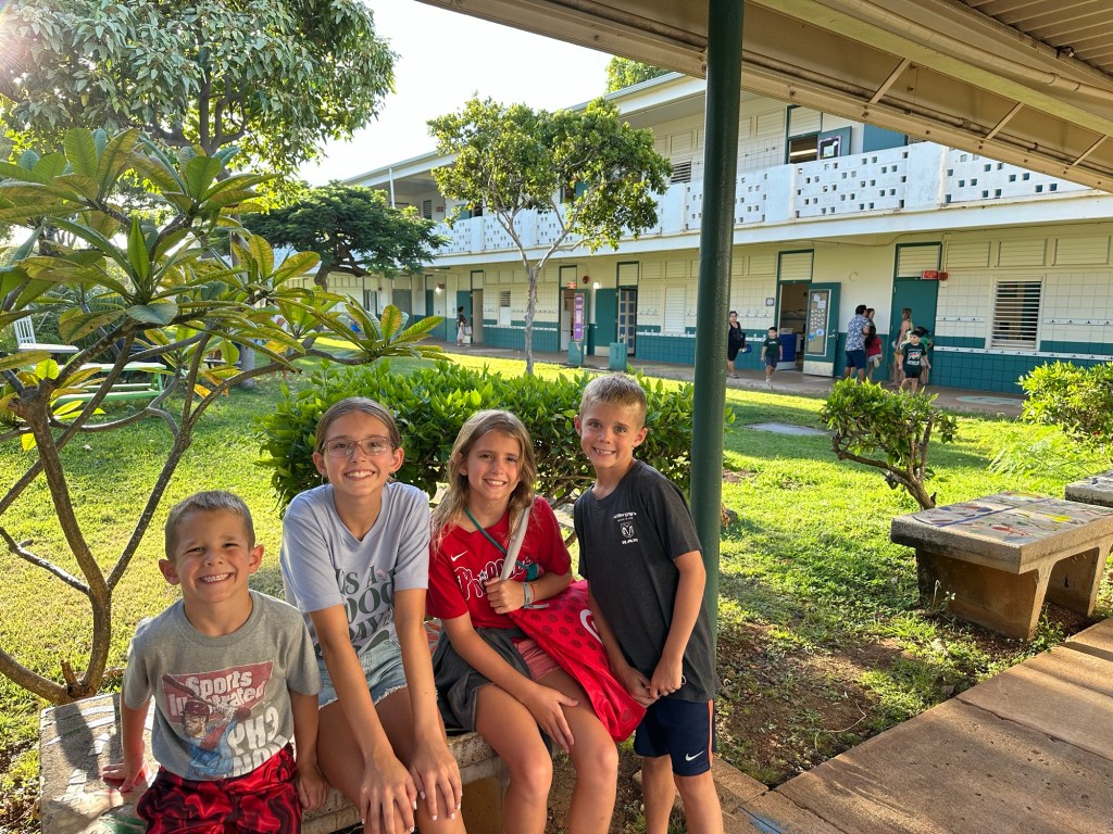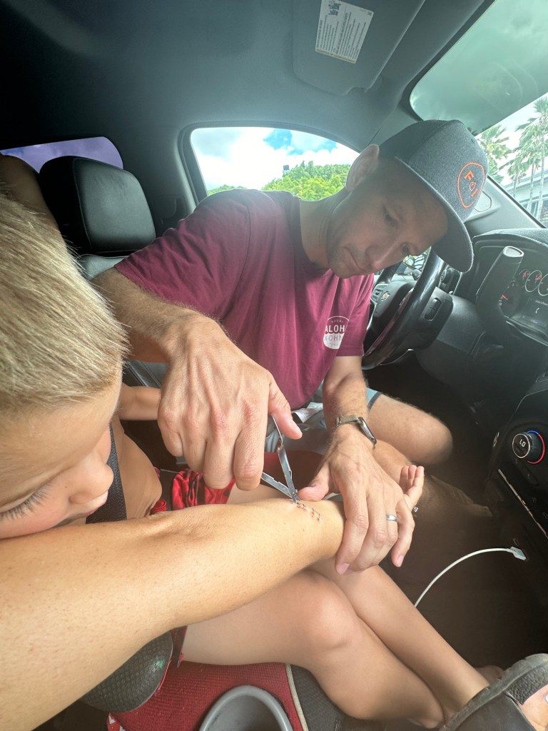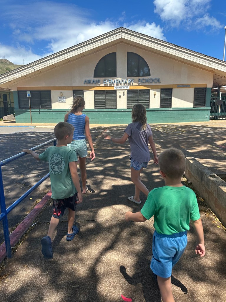 Arrived in Honolulu at 4:30pm local time (10:30pm EST) – tired and excited to get to our new home! Kids went swimming and Lish had a run in with the glass door so ended up in the ER for 6 staples (5 in the arm and 1 in the shin). An eventful start to our time here…and now we have tape on the doors so we don’t walk through them π
