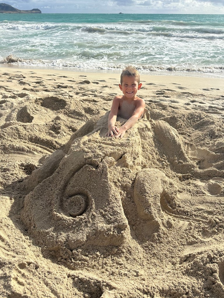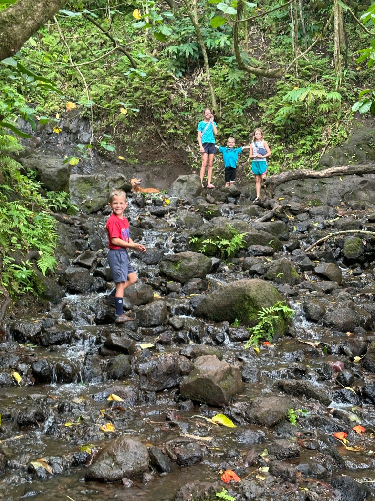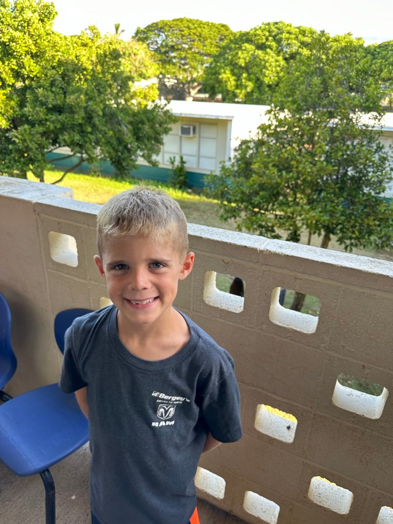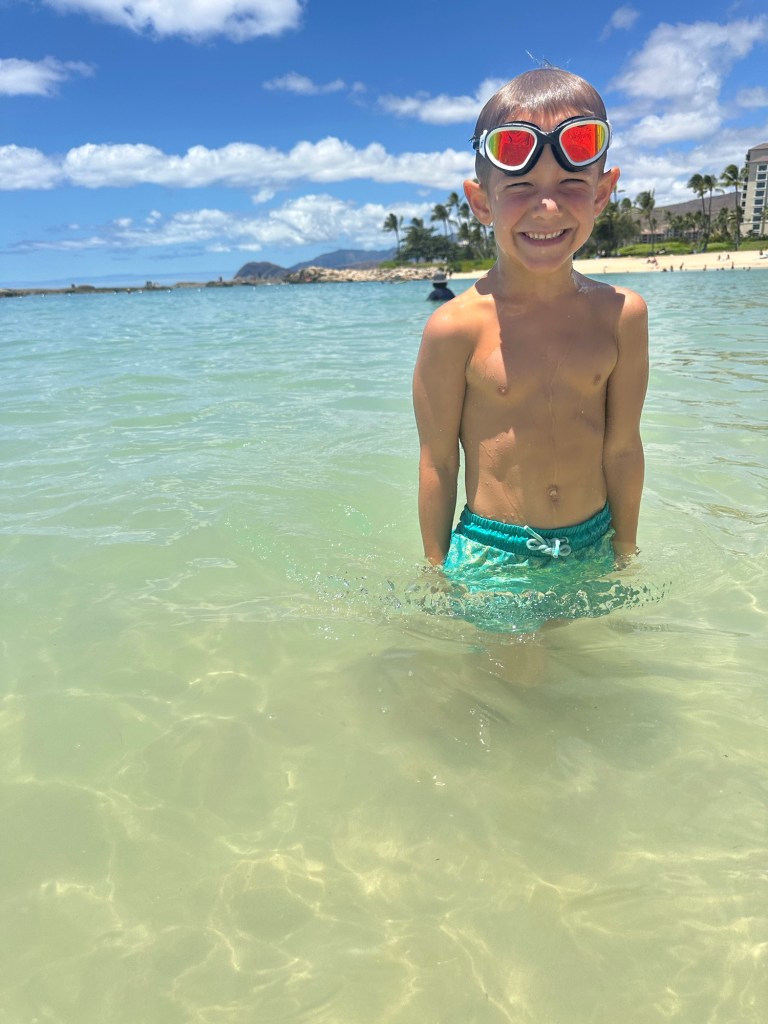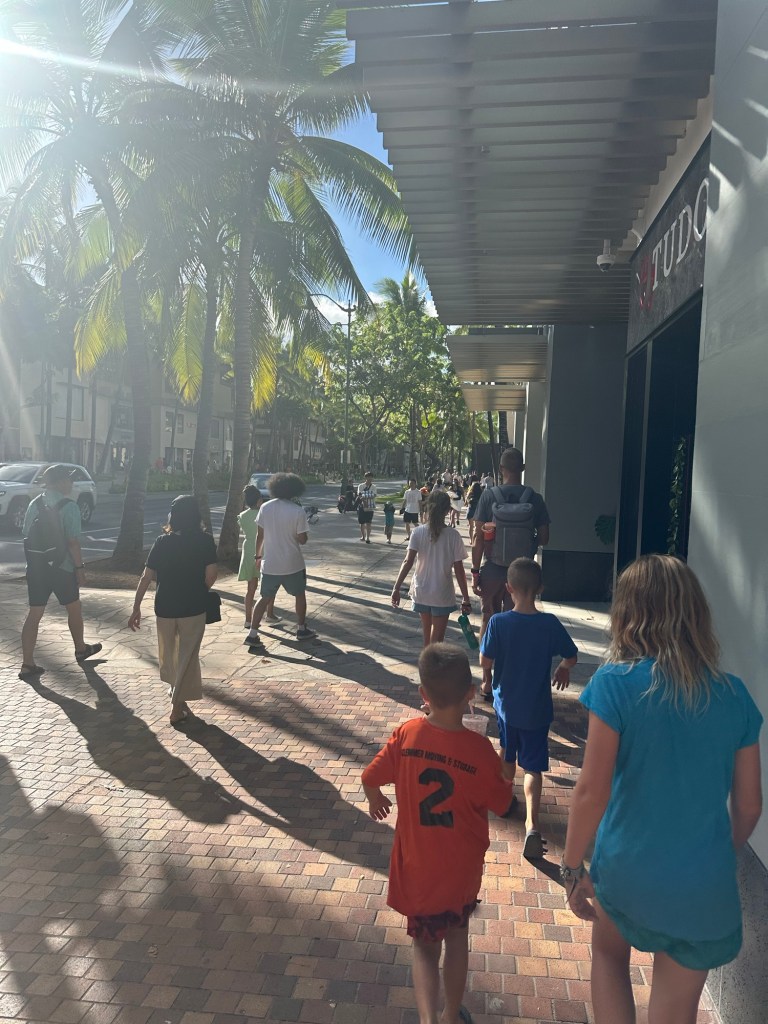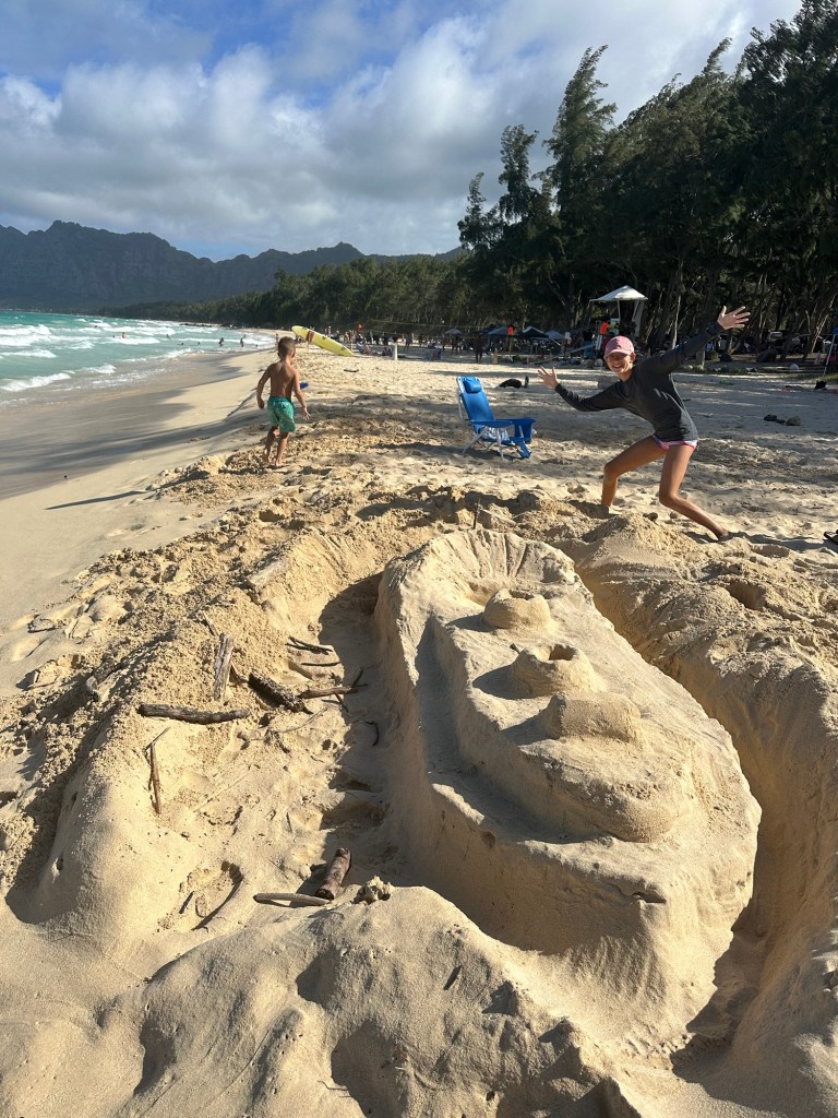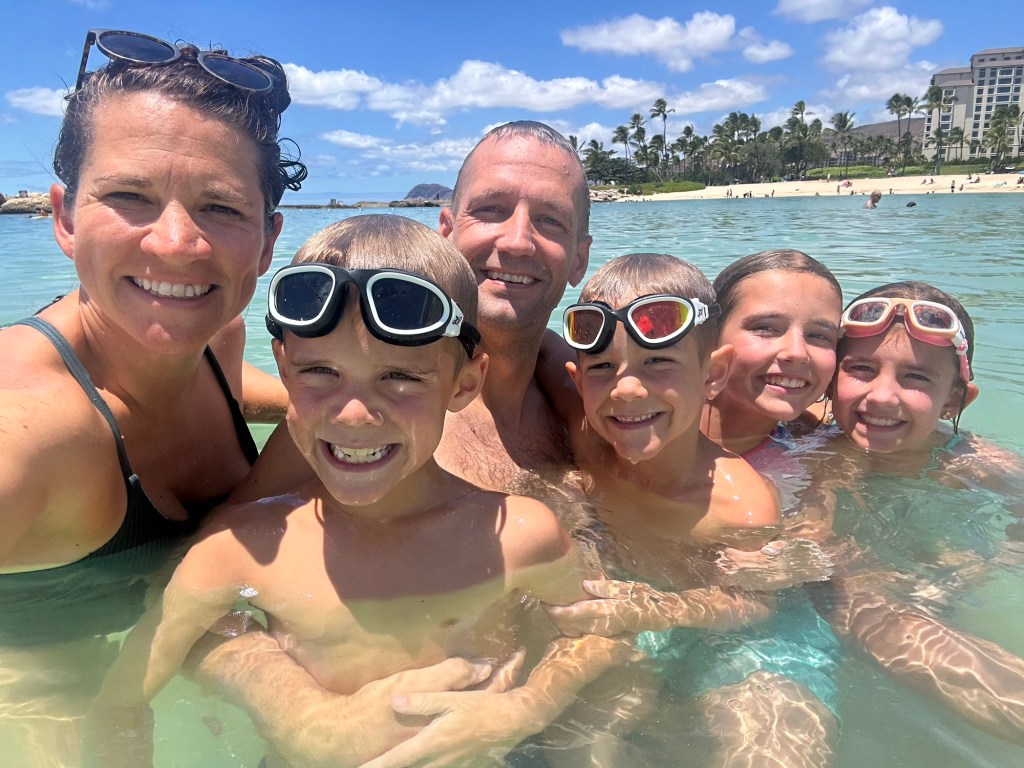 Arrived in Honolulu at 4:30pm local time (10:30pm EST) – tired and excited to get to our new home! Kids went swimming and Lish had a run in with the glass door so ended up in the ER for 6 staples (5 in the arm and 1 in the shin). An eventful start to our time here…and now we have tape on the doors so we don’t walk through them π